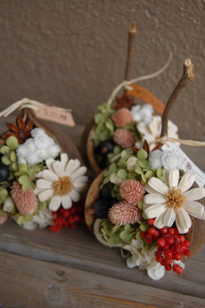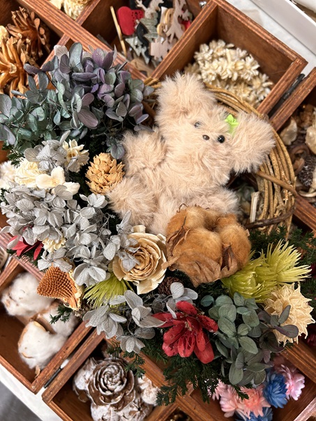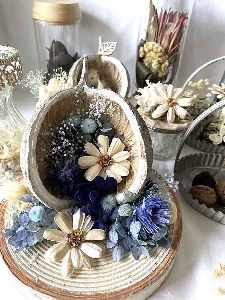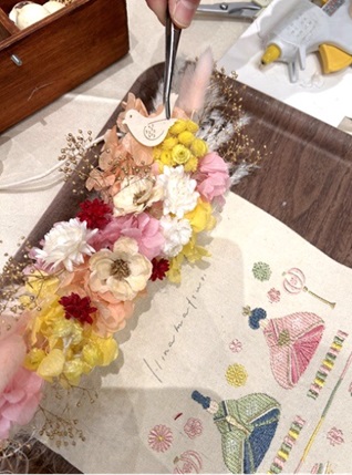プリザーブドフラワーとドライフラワーを使って、季節のアレンジを仕上げていきます。