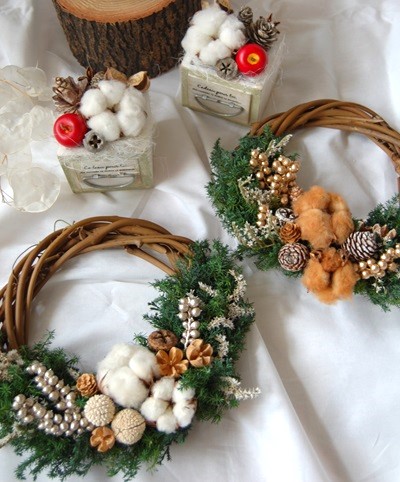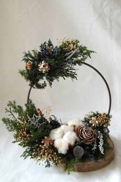 しめ縄といえどタッセル型やリース型も多く、最近ではナチュラルで可愛いタイプが流行しています。それに合わせて、コットンや実物、グリーンで飾り付けます。雑貨感覚で楽しめるので、フラワーアレンジの経験がなくても、楽しく出来ます。
