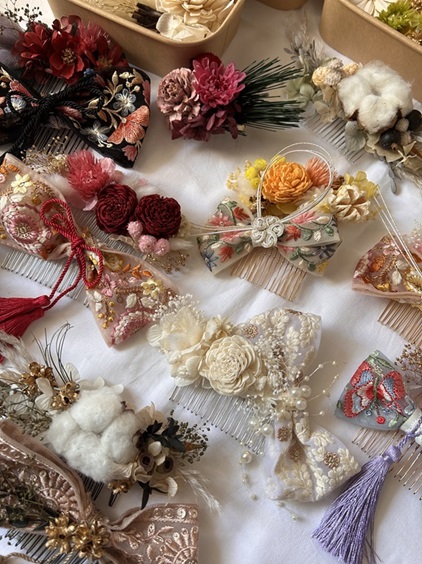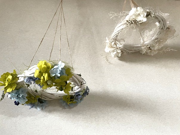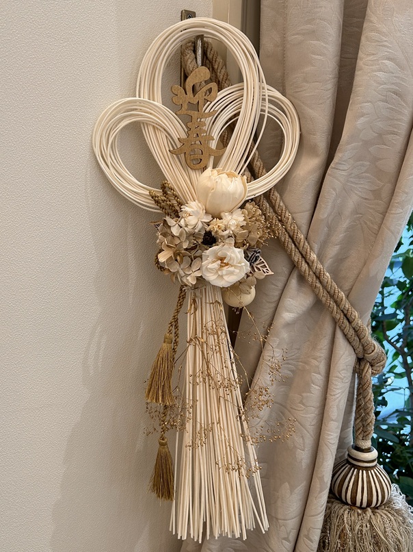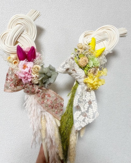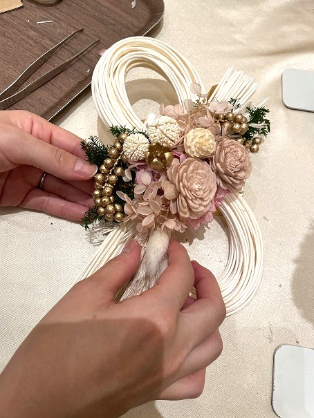 プリザーブドフラワーやドライフラワーを使って、しめ縄を仕上げていきます。しめ縄と言えば純日本で、厳かな感じでしたが、今ではお部屋のインテリアや料理のお飾りで、SNSや写真に使われています。和風リースや壁掛けアレンジとしても密かに人気です。