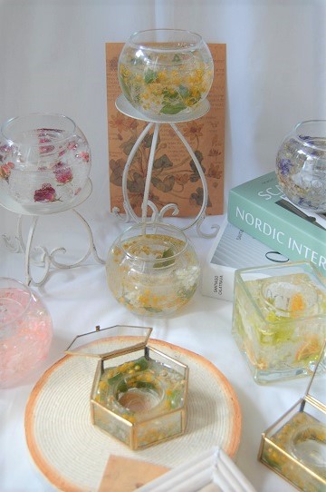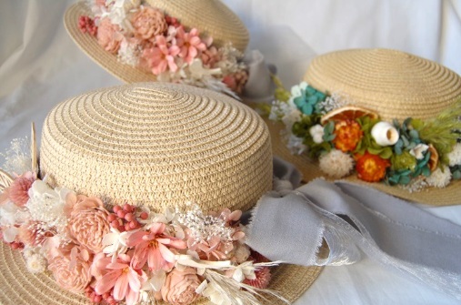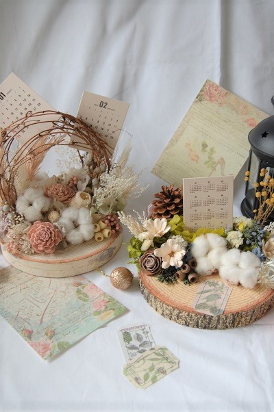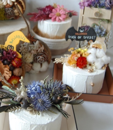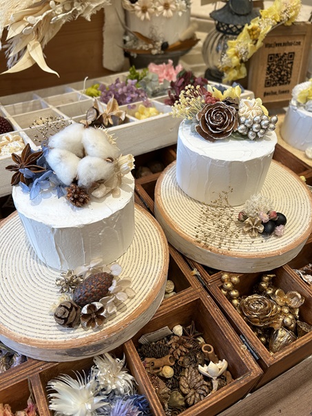 プリザーブドフラワーやドライフラワーを、お好きな種類や色を選んで、アレンジして頂きます。ケーキトレーの部分もお選びくださいね。